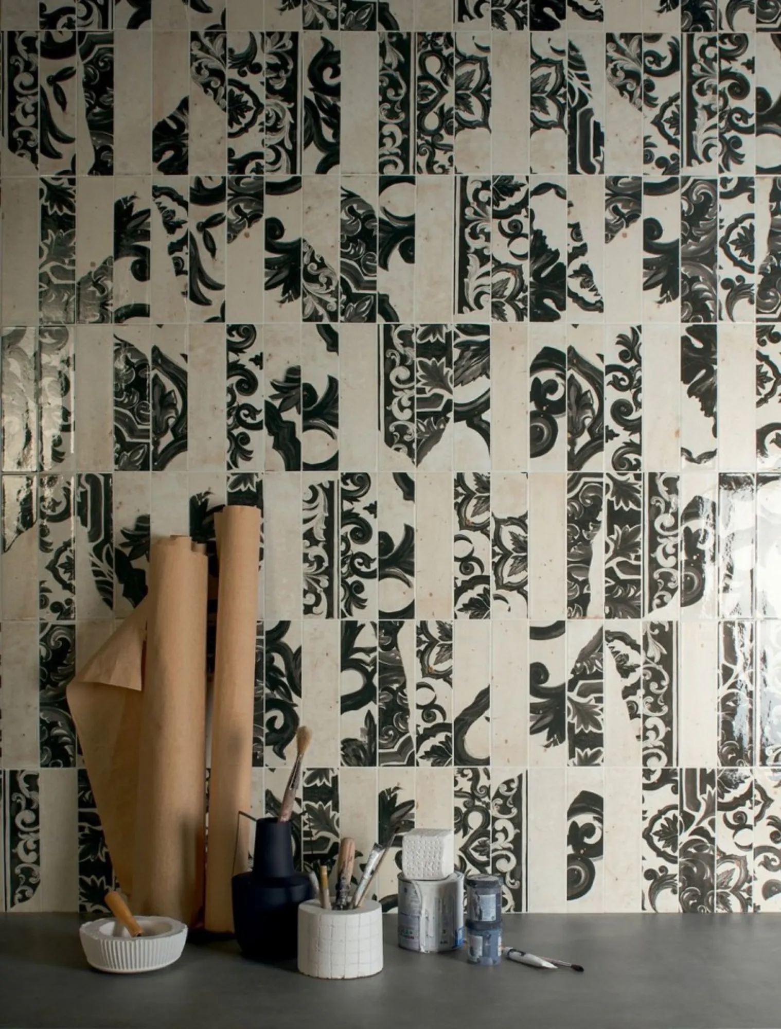 Fregio is a decorative wall tile collection that captures the charm of the Mediterranean-style Majolica pottery on subway shaped tiles. Characterised by an ornate designs that capture the wear and tear of time, with the shiny decorative surfaces appearing to have been eroded and erased. Where the white base tile emerges, faux chipping appears to reveal the colour of the red clay beneath. Transform any space—be it your bedroom, bathroom, kitchen, laundry, or bar—with the exquisite and unique design of the Fregio Collection. These tiles turn interior walls into artistic masterpieces.