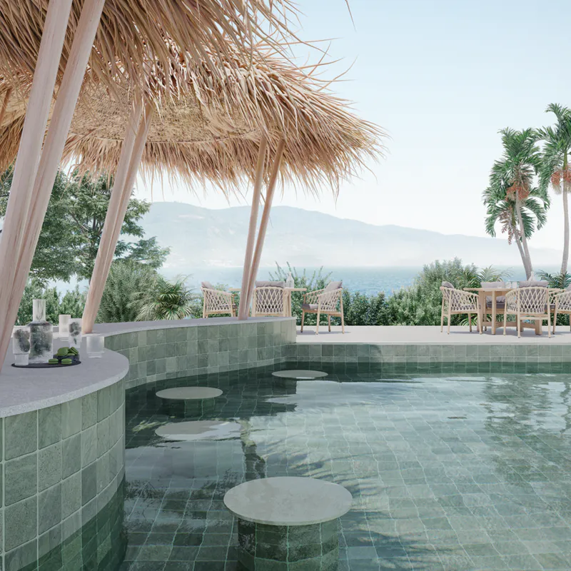 Sukabumi is a glazed porcelain range from Spain. The design is Inspired by the Sukabumi stone, valued for its natural aesthetic and purifying capabilities. Conceived for aquatic spaces and lounging areas where water is the leading element. 50 different patterns randomly mixed within each box. This collection has also been created using a specially formulated matt enamel for use both indoors and outdoors. A very ideal option to deliver a consistent indoor - outdoor flow for your house.